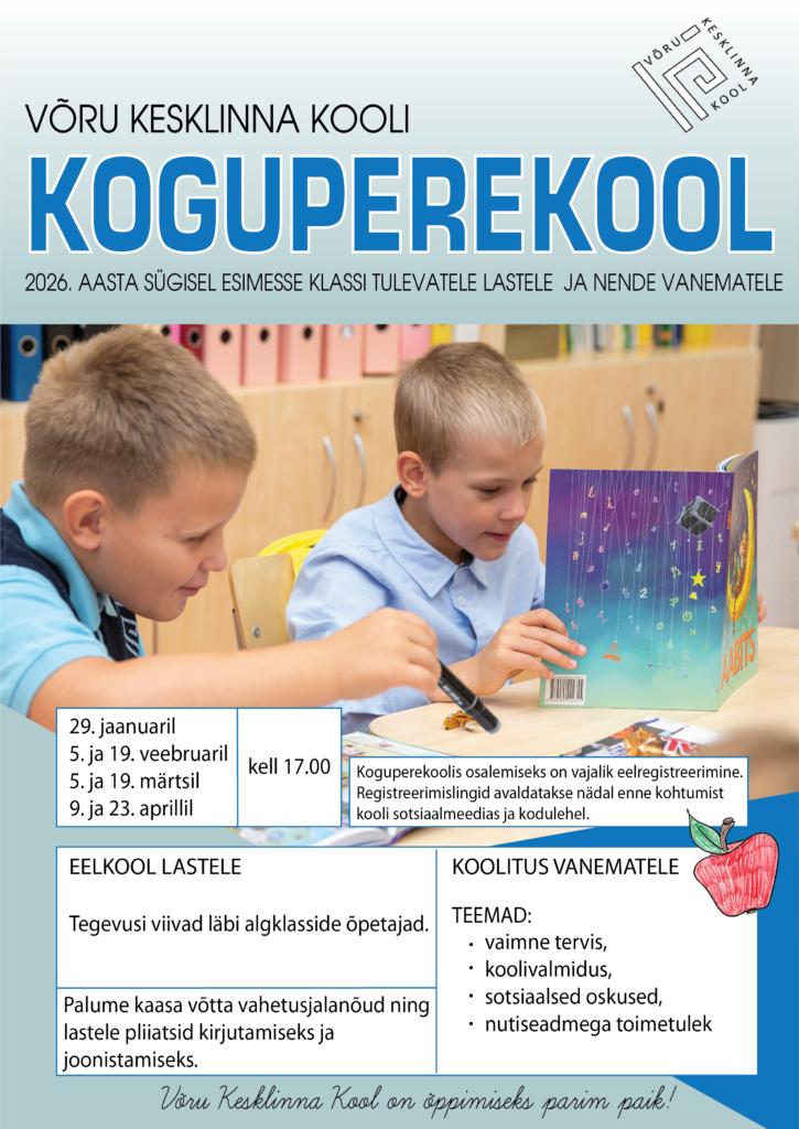 Ka sel õppeaastal avame koguperekooli. Koguperekooli on oodatud kõik 2026.a sügisel kooli tulevad õpilased ja nende vanemad.
